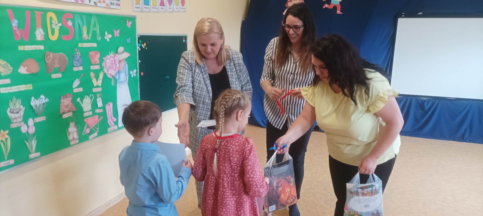 Dwoje dzieci otrzymuje dyplomy i nagrody z rąk trzech kobiet