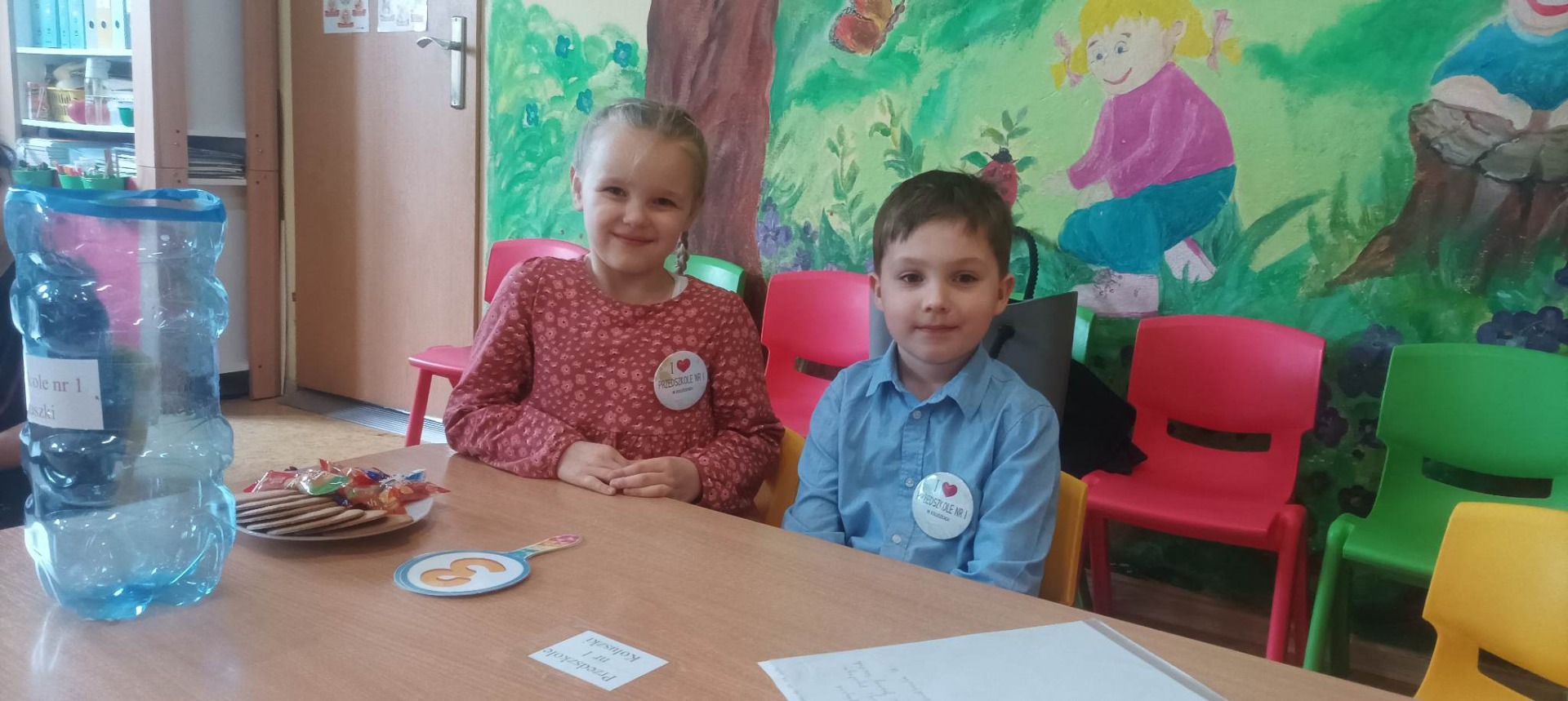 dwoje dzieci chłopiec i dziewczynka siedzą uśmiechnięci przy stoliku