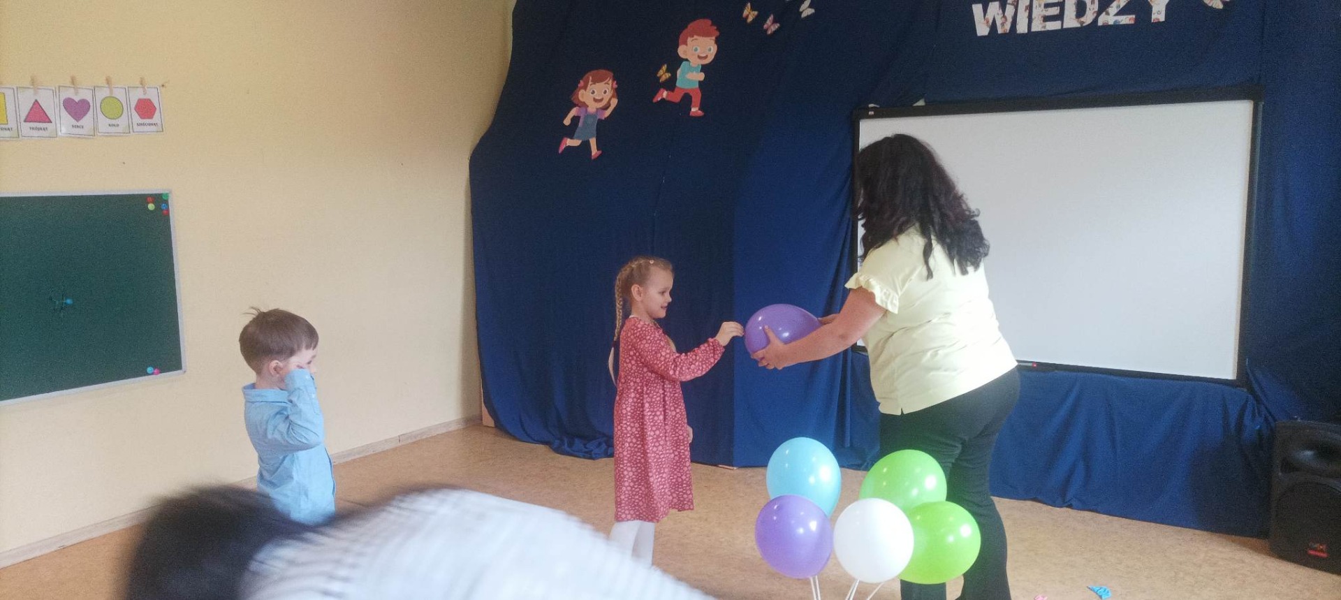 Dziewczynka przekuwa fioletowy balon który trzyma w rękach kobieta stojąca przed nią