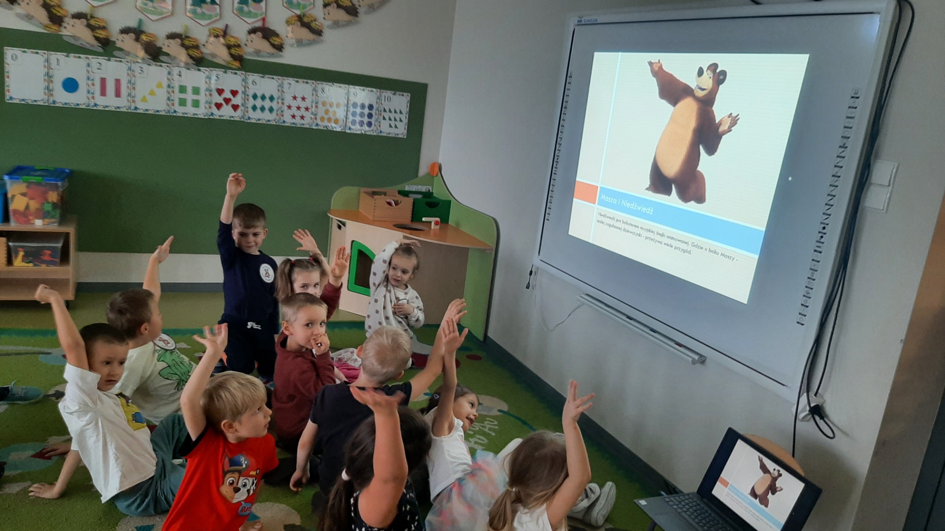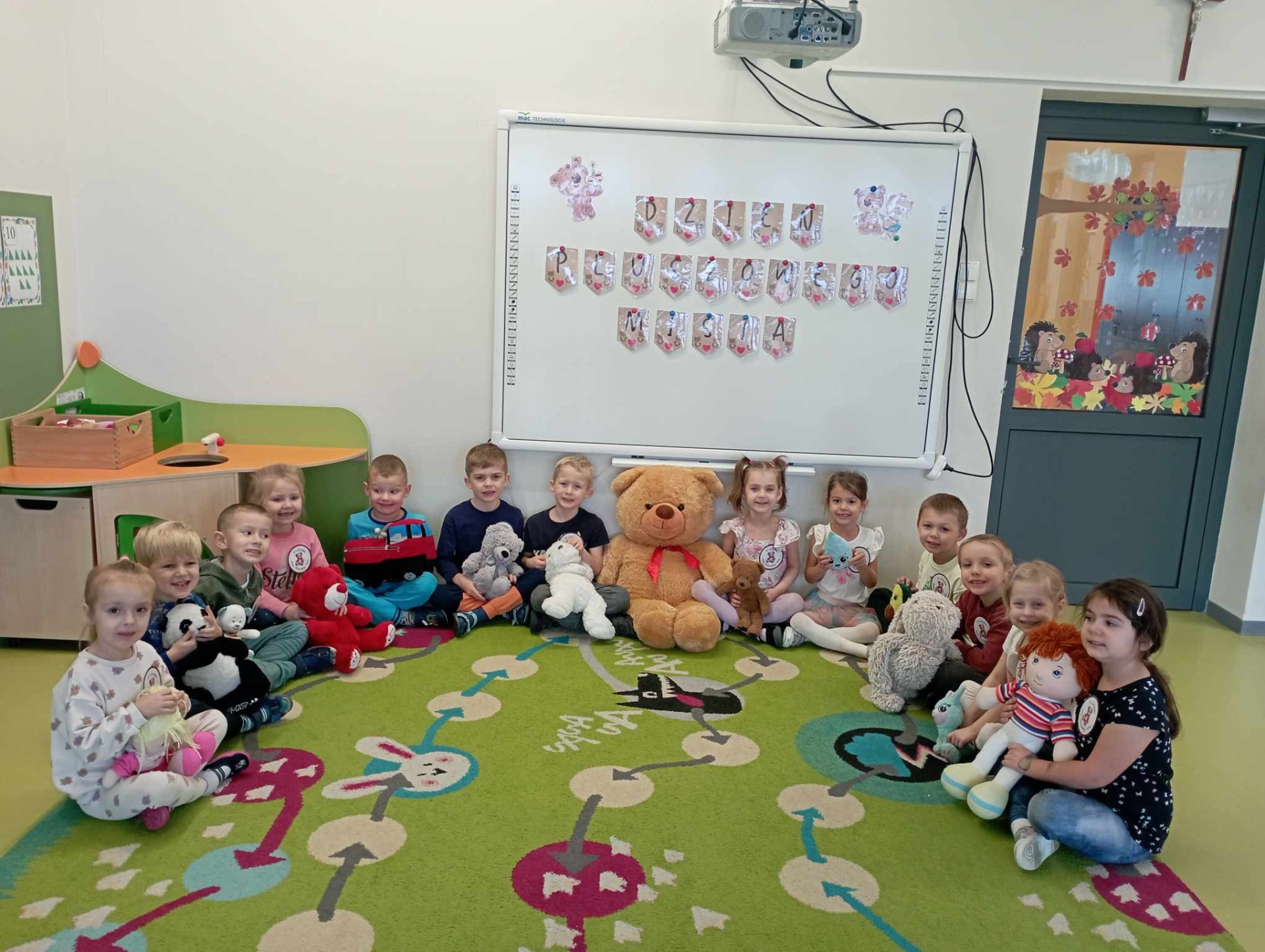dzieci siedzą w półkolu pośrodku jest duży pluszowy miś