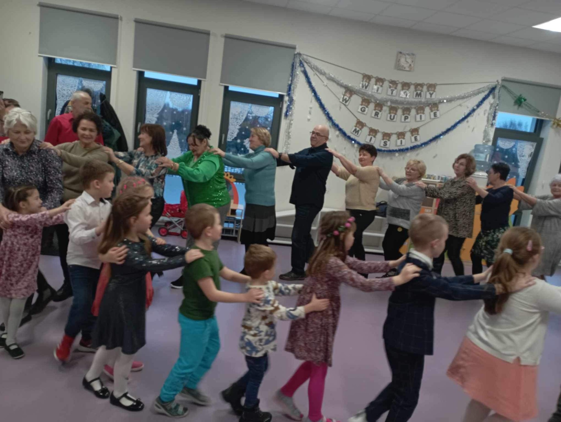 dziadkowie z wnukami tańczą i bawią się wspólnie