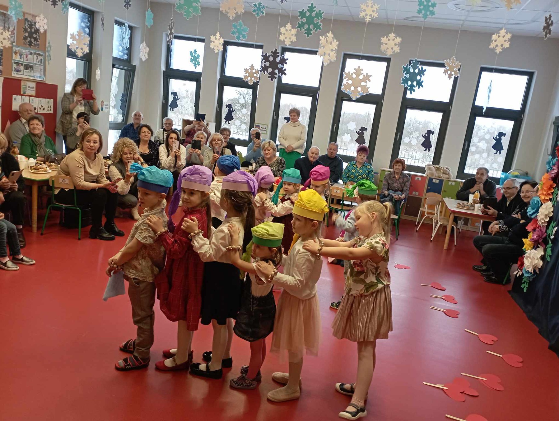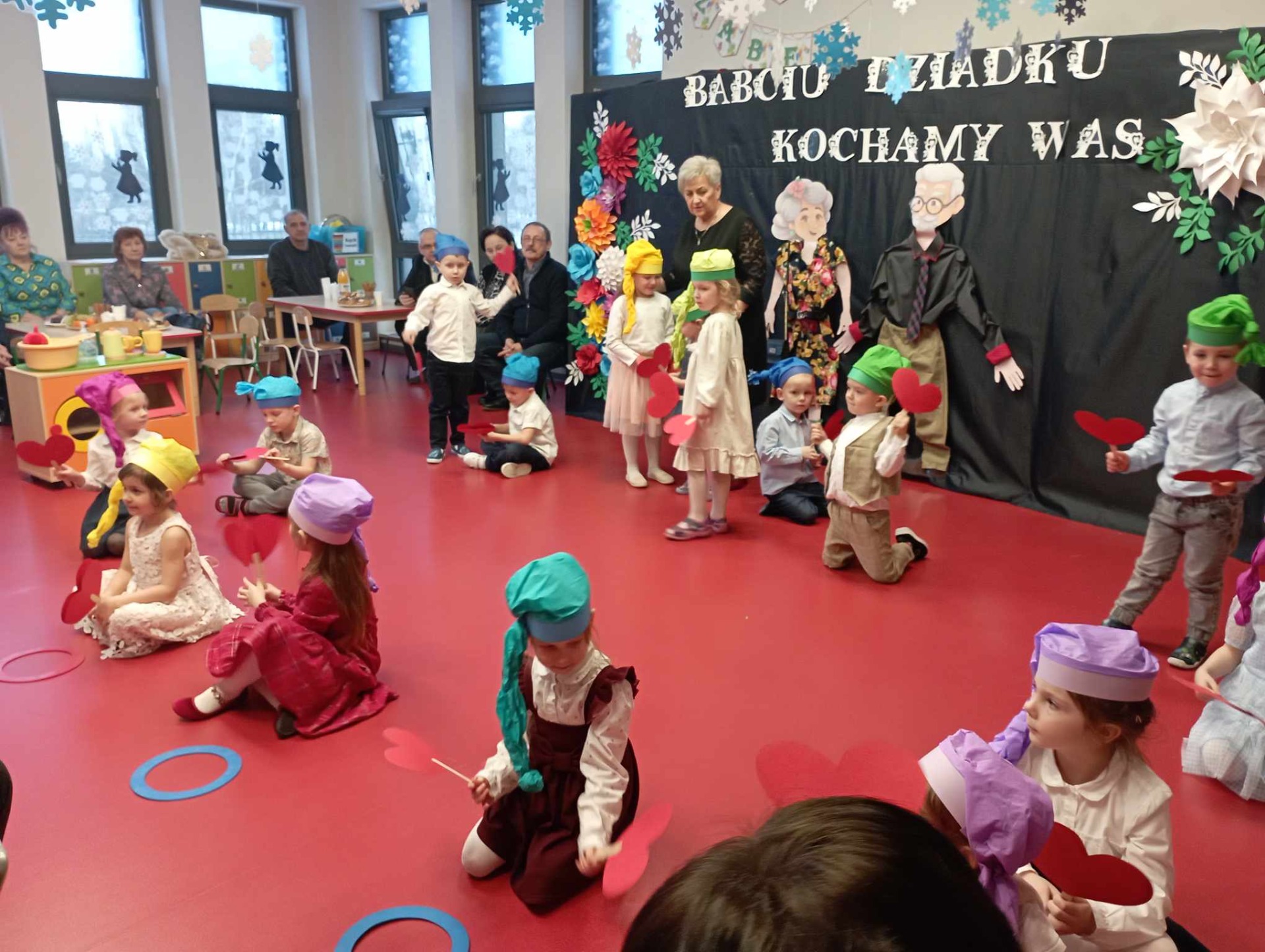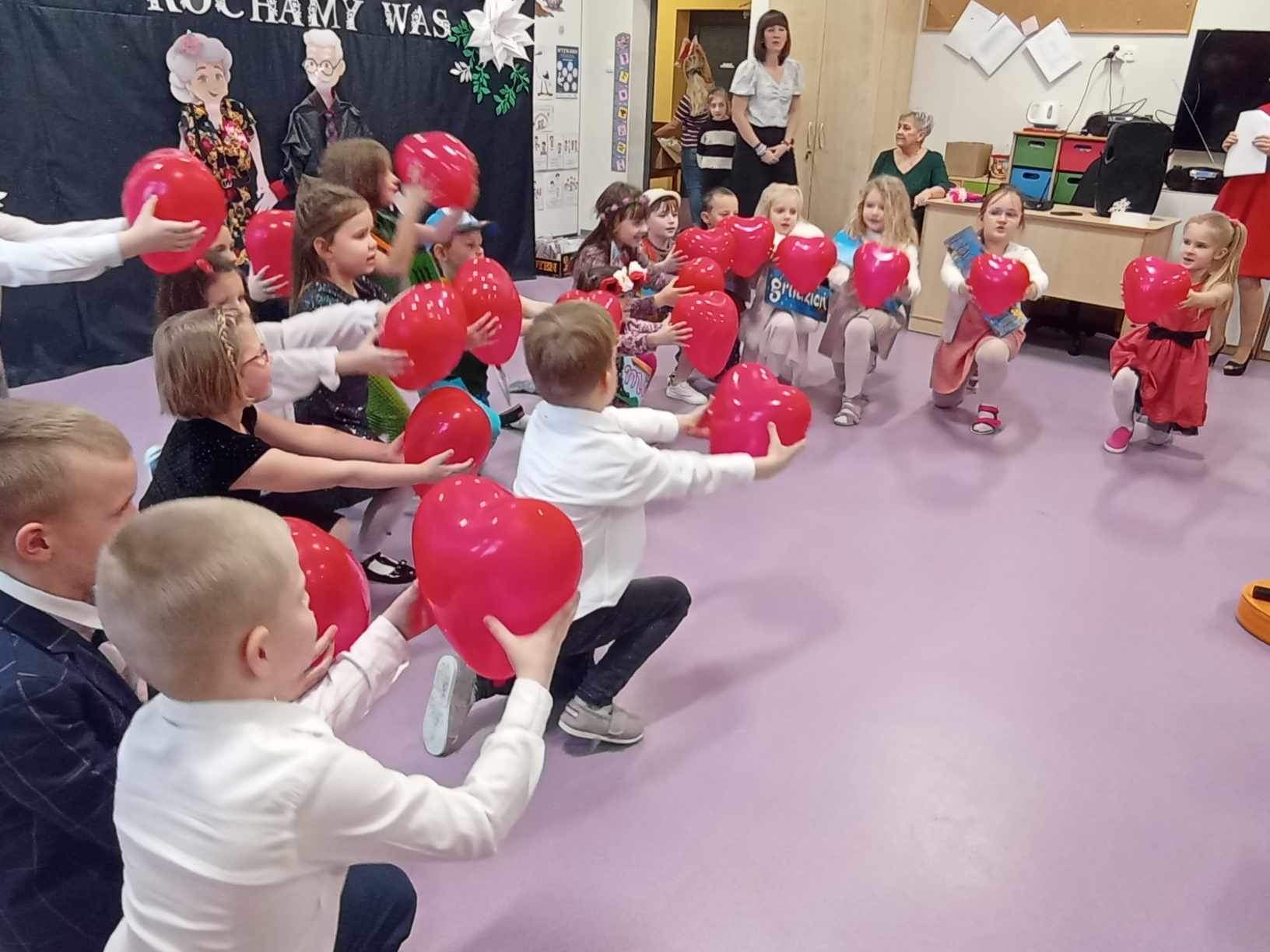 dzieci występujące dla babci i dziadka z okazji ich święta trzymają czerwone balony w kształcie serduszek