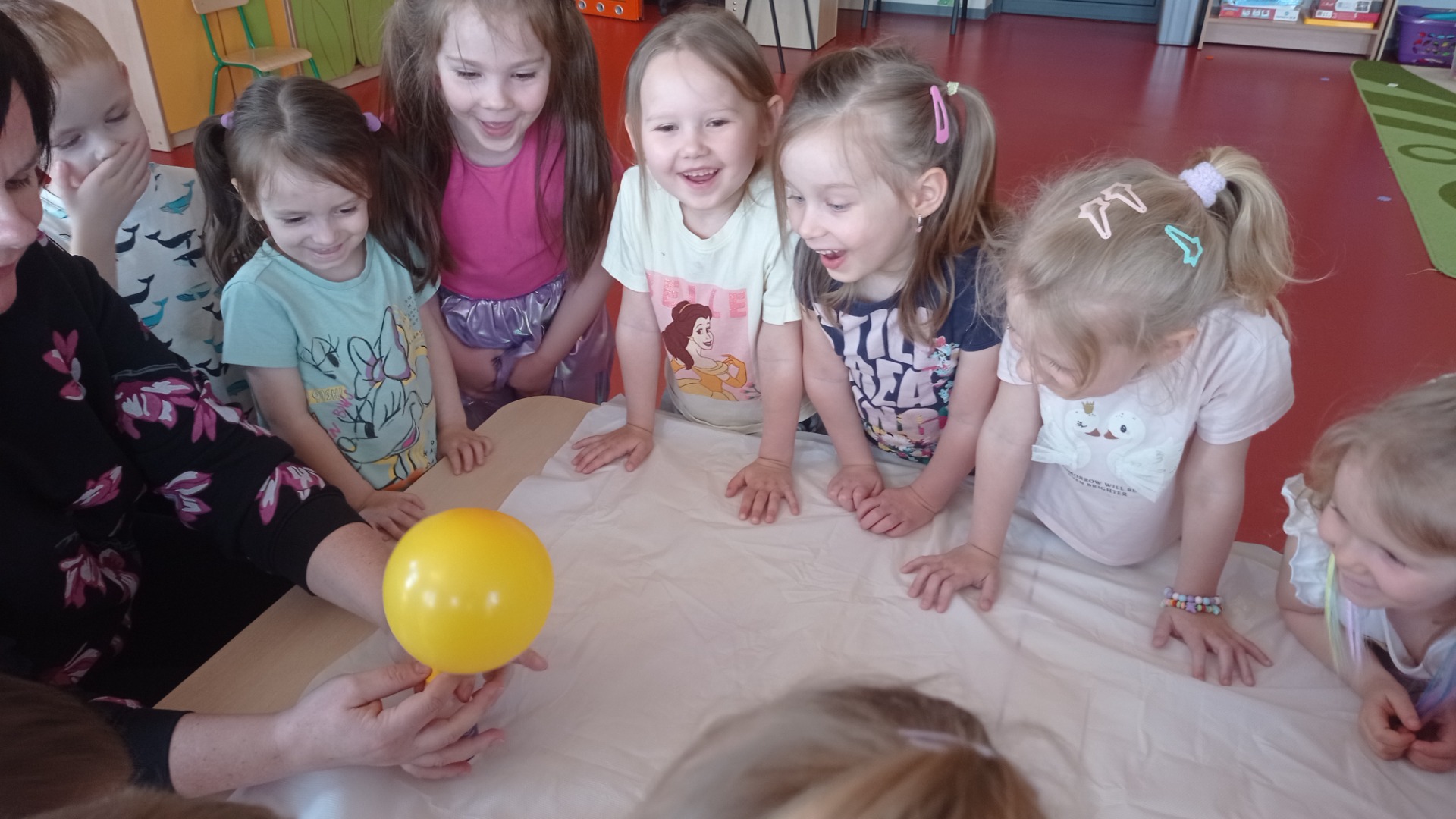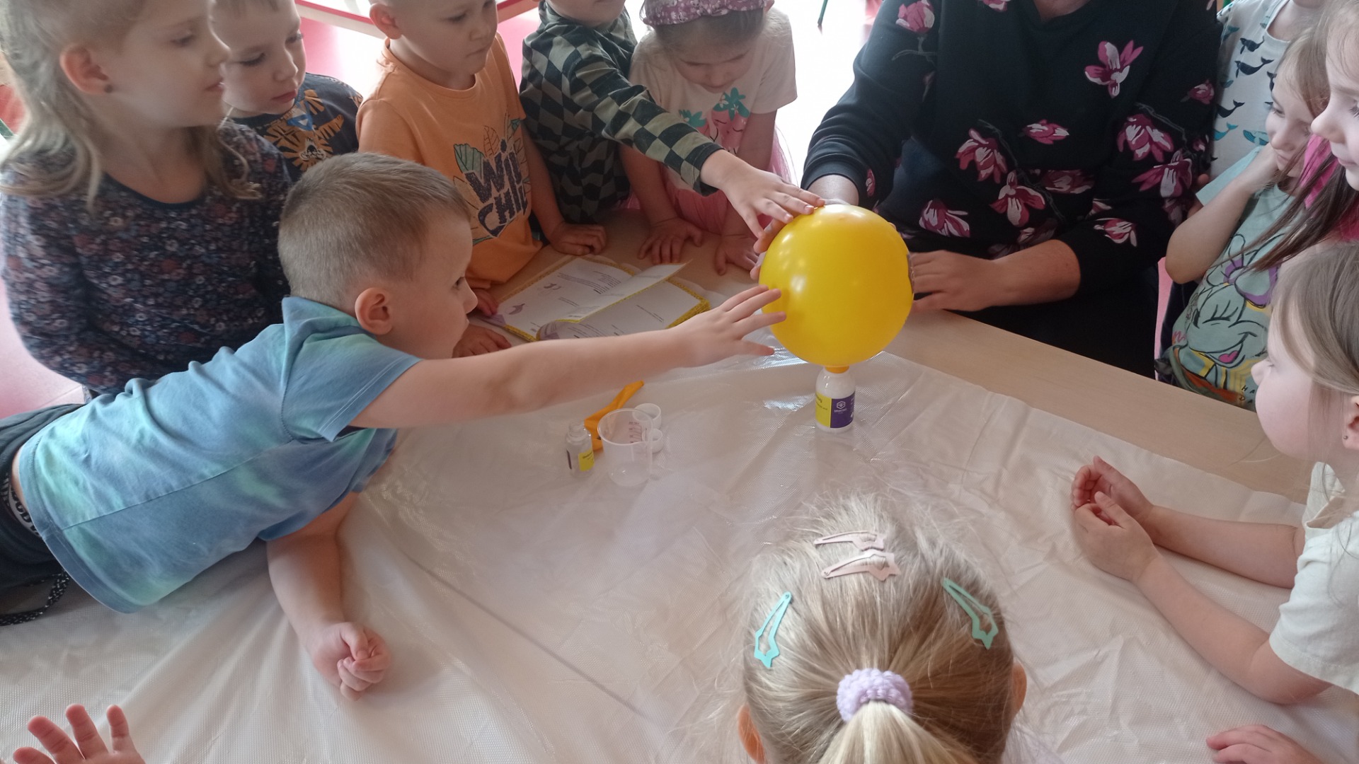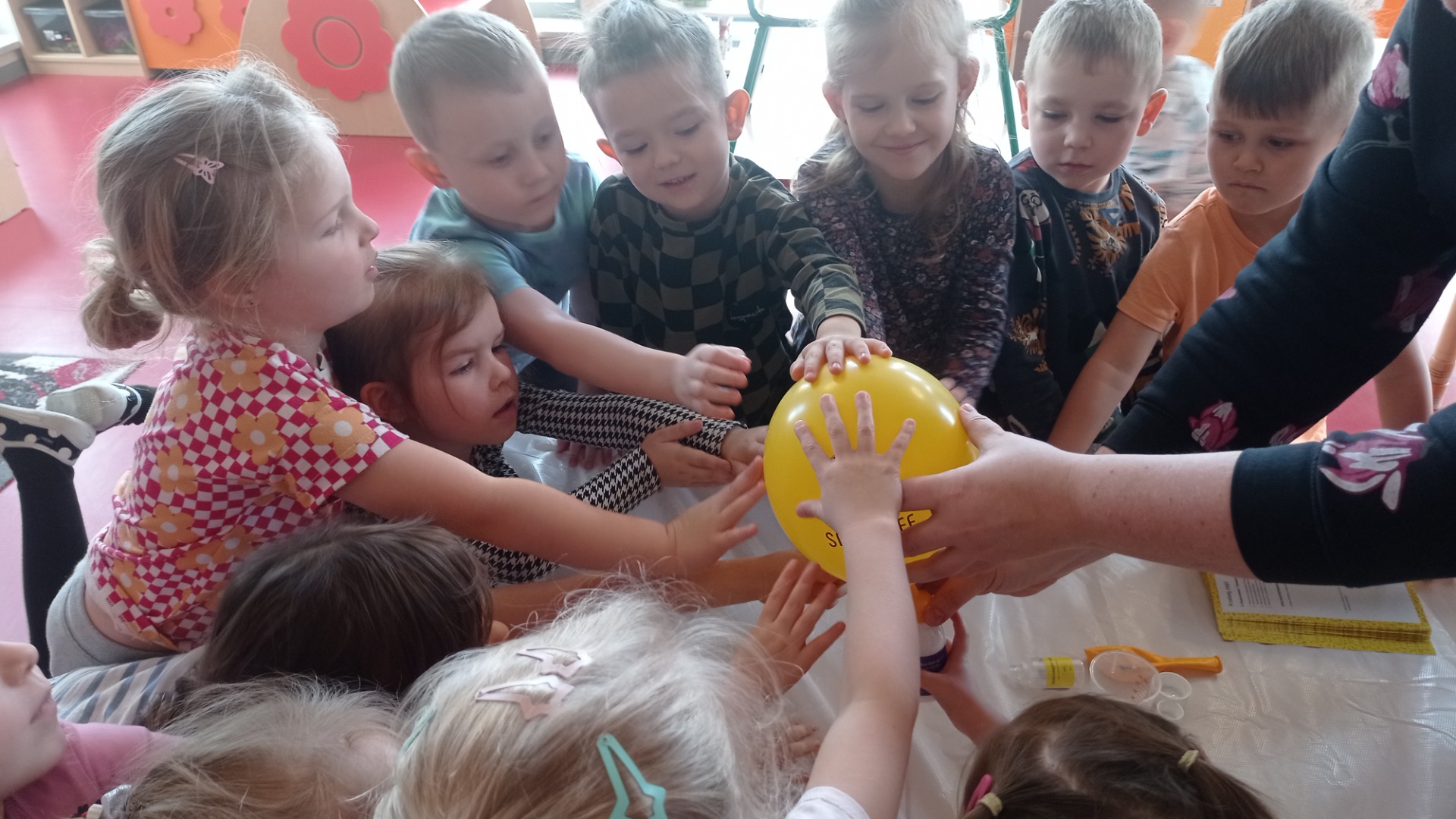 grupa dzieci patrząca na eksperyment z żółtym balonem