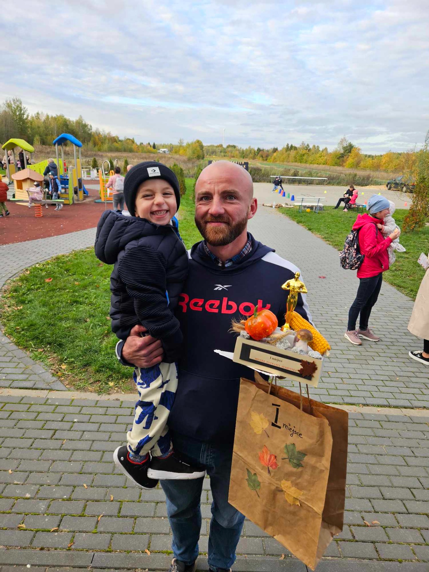 chłopiec trzymany przez swojego tatę z nagrodą za zajęcie pierwszego miejsca w konkursie