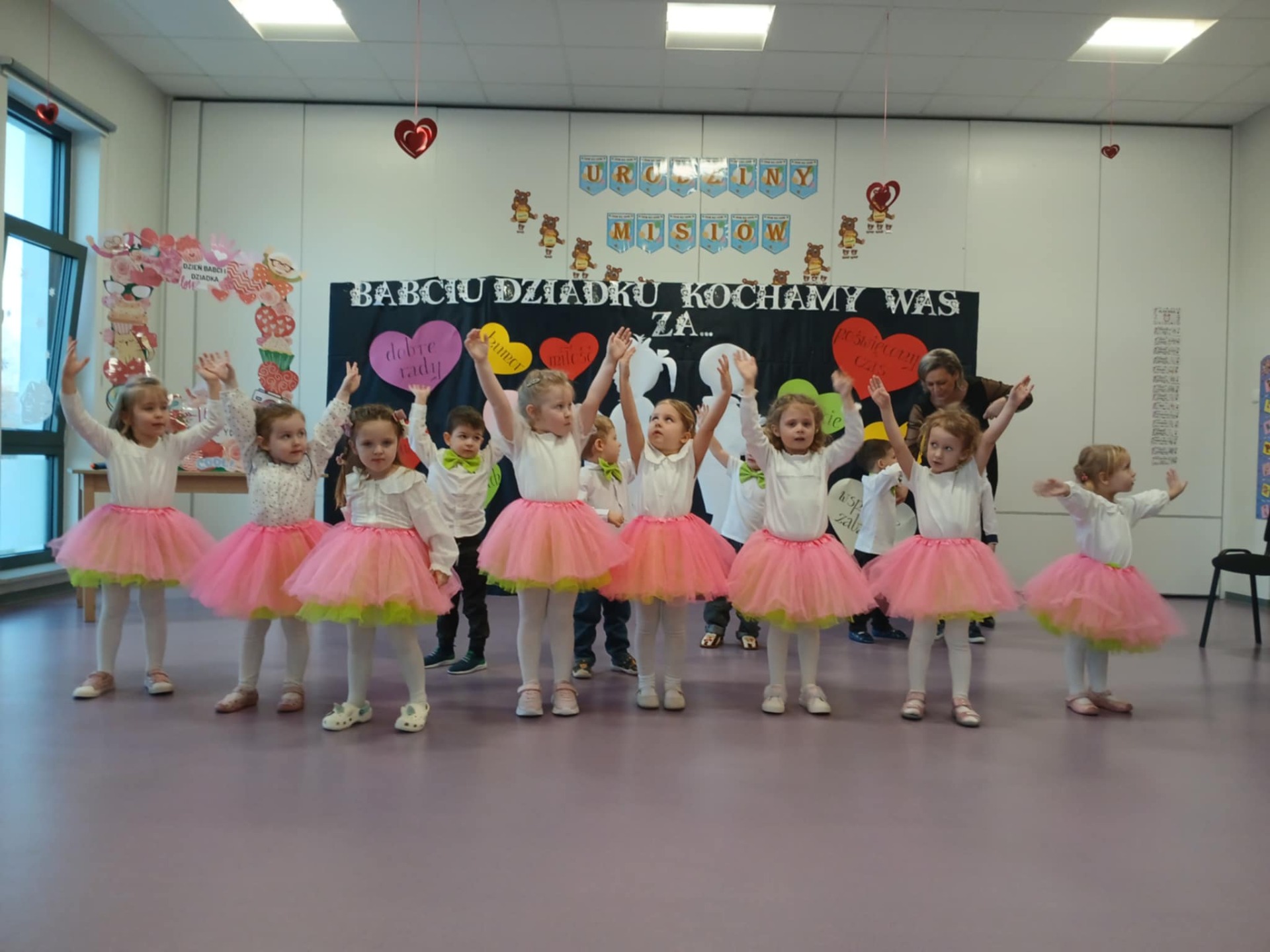 dziewczynki tańczą w różowych spódniczkach na dzień babci i dziadka