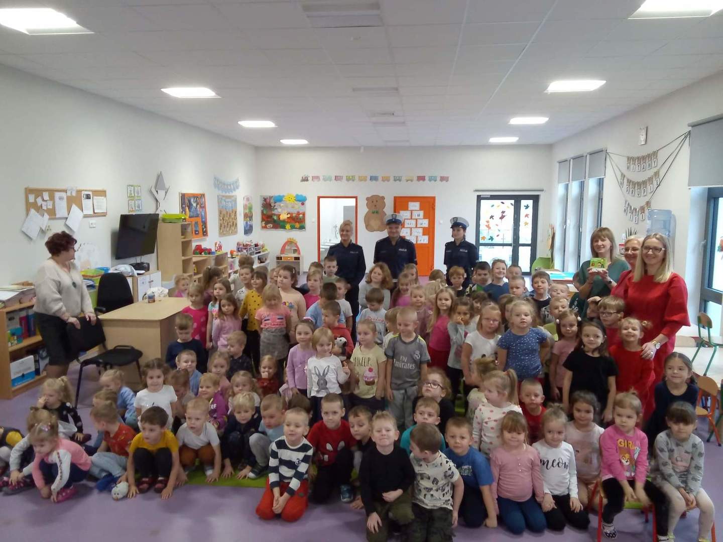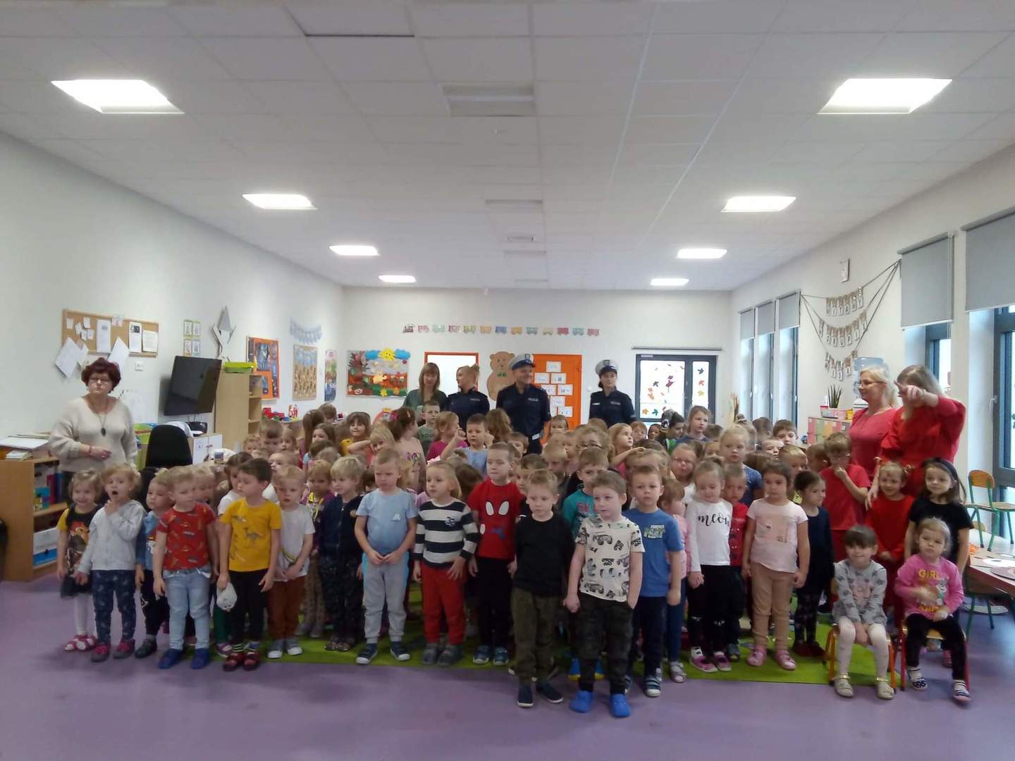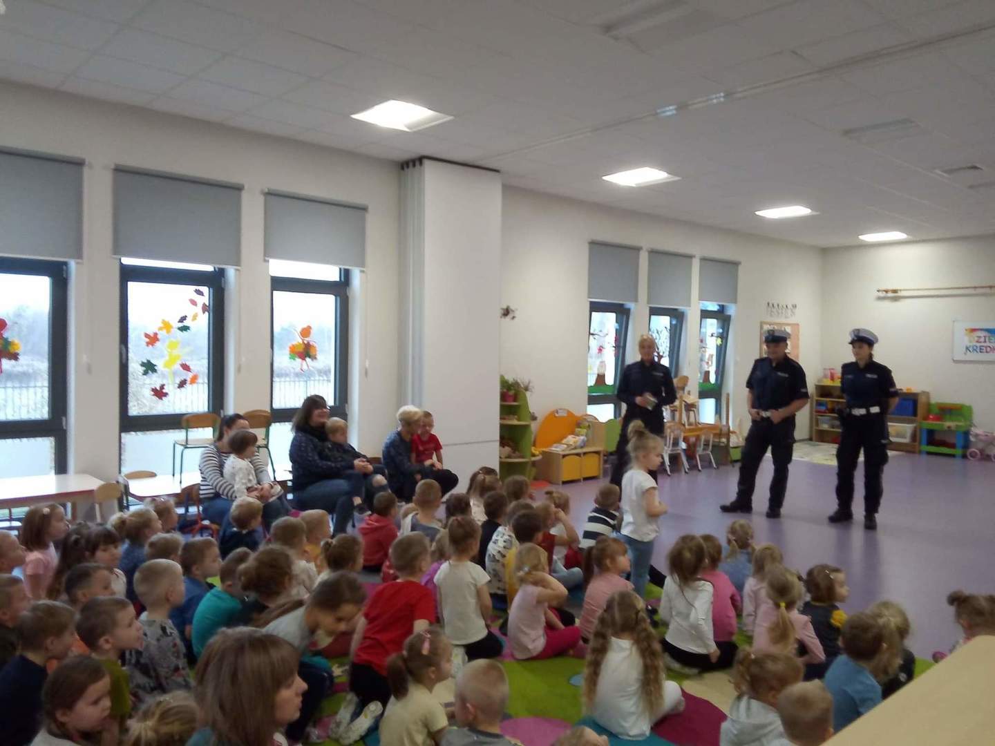 Policjanci uświadomili przedszkolakom jak ważna i konieczna jest jazda w fotelikach z zapiętymi pasami.Pokazali postawę jaką trzeba przyjąć podczas ataku psa. Przestrzegali również o nie zawieraniu znajomości z obcą osobą.