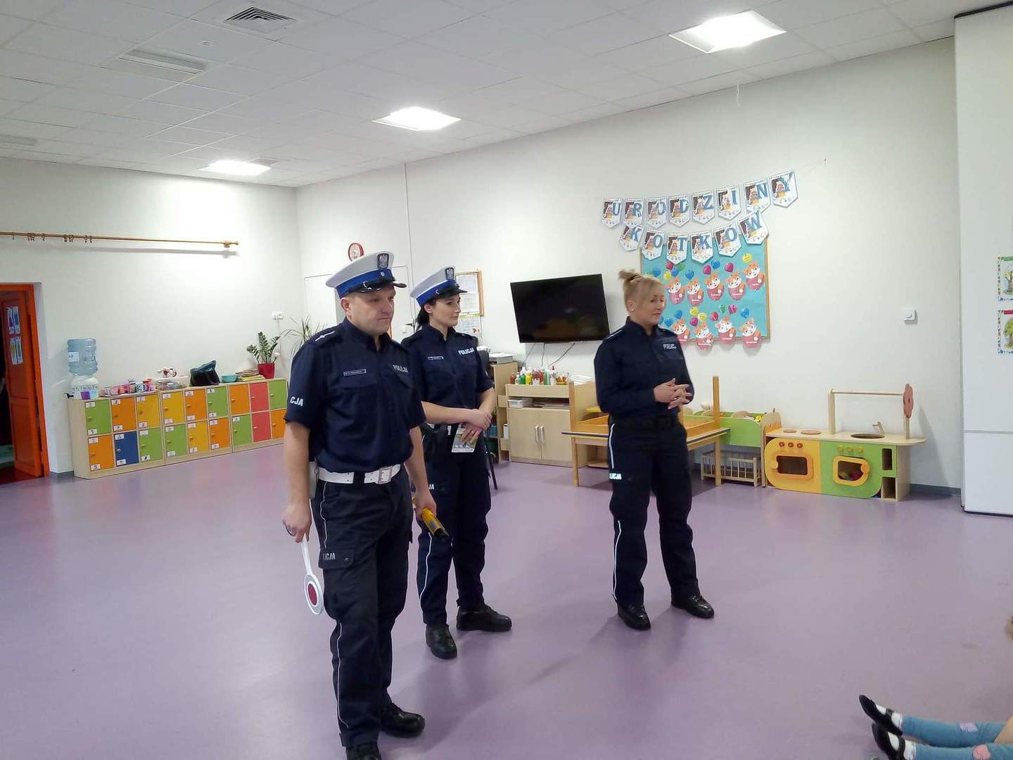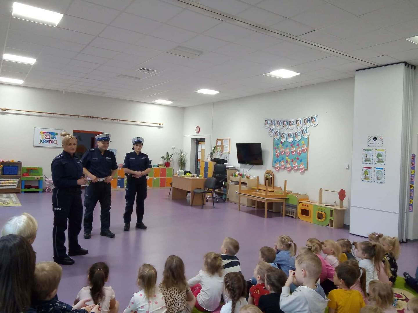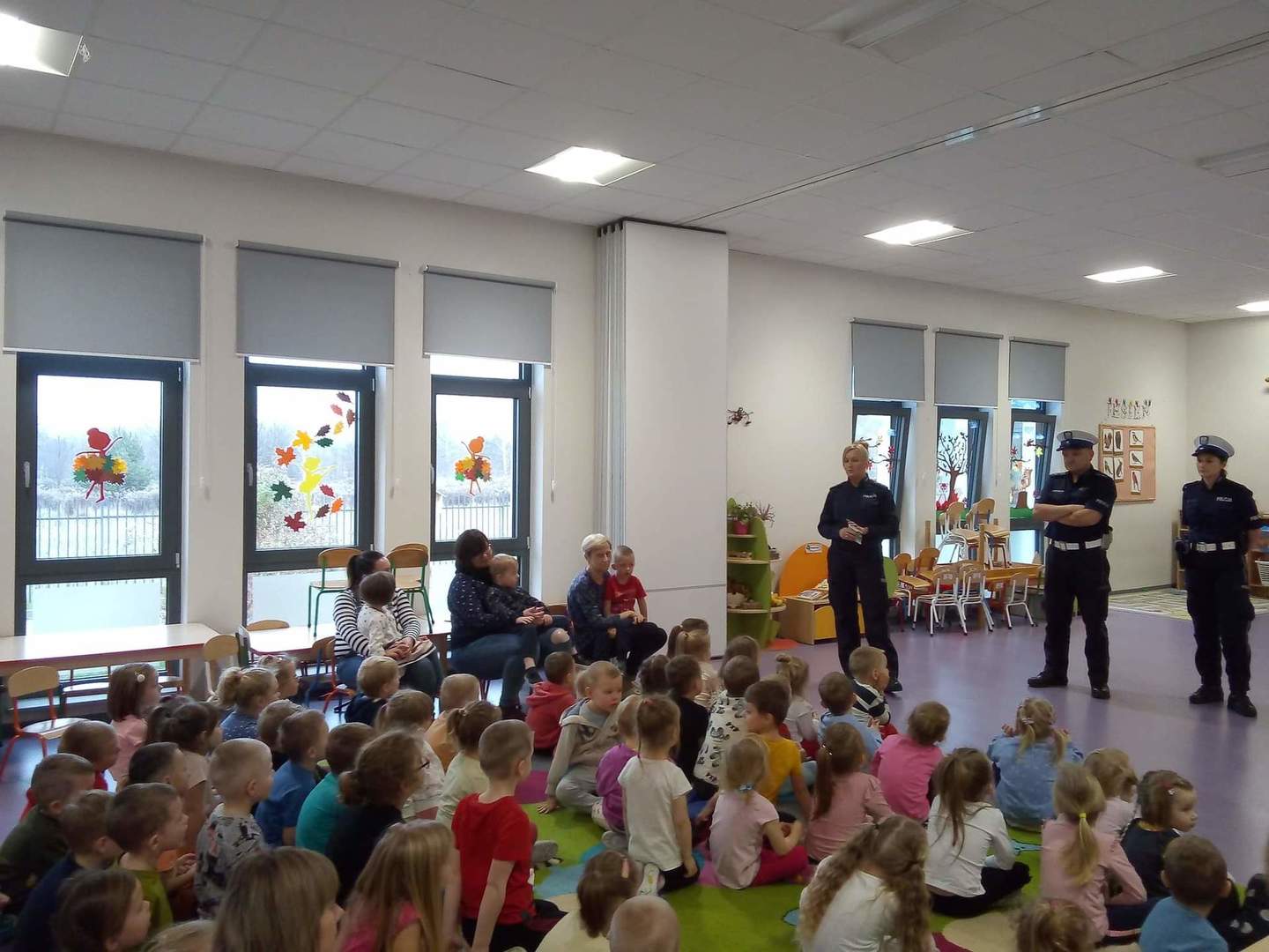 Policjanci uświadomili przedszkolakom jak ważna i konieczna jest jazda w fotelikach z zapiętymi pasami.Pokazali postawę jaką trzeba przyjąć podczas ataku psa. Przestrzegali również o nie zawieraniu znajomości z obcą osobą.