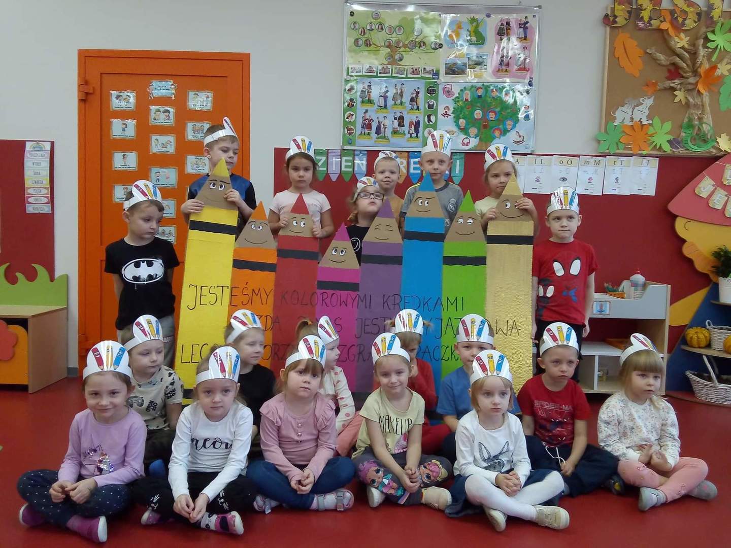 Tego dnia odbywały się zabawy z kredkami w roli głównej! Dzieci układały m.in. ciekawe kompozycje i porządkowały kredki względem określonej cechy.