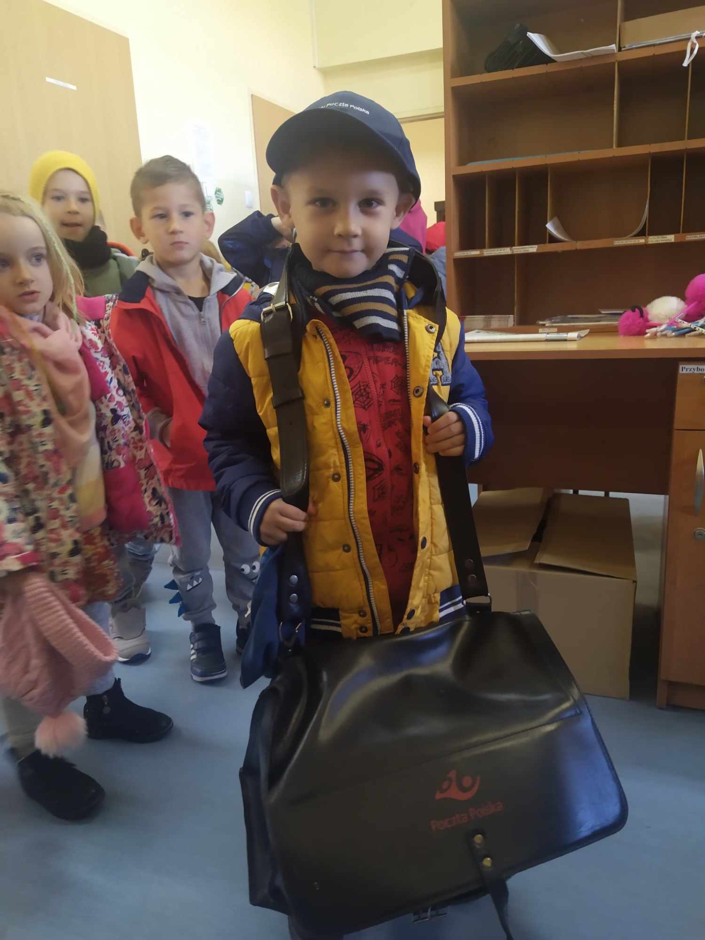 18 października obchodziliśmy w naszym przedszkolu Dzień Poczty Polskiej. Poznaliśmy zawód listonosza i jego obowiązki. Teraz już wiemy, że to on dostarcza do domów wszystkie listy i paczki. Dzieci dowiedziały się jak długą drogę musi przebyć list lub paczka, by trafił do naszej skrzynki pocztowej. Mieliśmy także okazję odwiedzić pobliski Urząd Pocztowy w Koluszkach, aby przyjrzeć się mu z bliska i utrwalić zdobyte w przedszkolu wiadomości na temat tej instytucji użyteczności publicznej. Z wielkim zainteresowaniem oglądały pomieszczenia poczty, mogły zaobserwować pracę urzędnika pocztowego i uświadomić sobie, jak wielkie znaczenie ma ten urząd w życiu codziennym. Dzieci poznały różne rodzaje listów: zwykłe, polecone, ekspresowe, lotnicze, kartki, telegramy; wzbogaciły słownictwo w zwroty: awizo, przesyłka, rozmowa telefoniczna. Utrwaliły znajomośc swojego adresu zamieszkania oraz adresu przedszkola. Z wielką niecierpliwością oczekiwały na przyjście listonosza, który wszystkim dał przymierzyć swoją wielką torbę....
