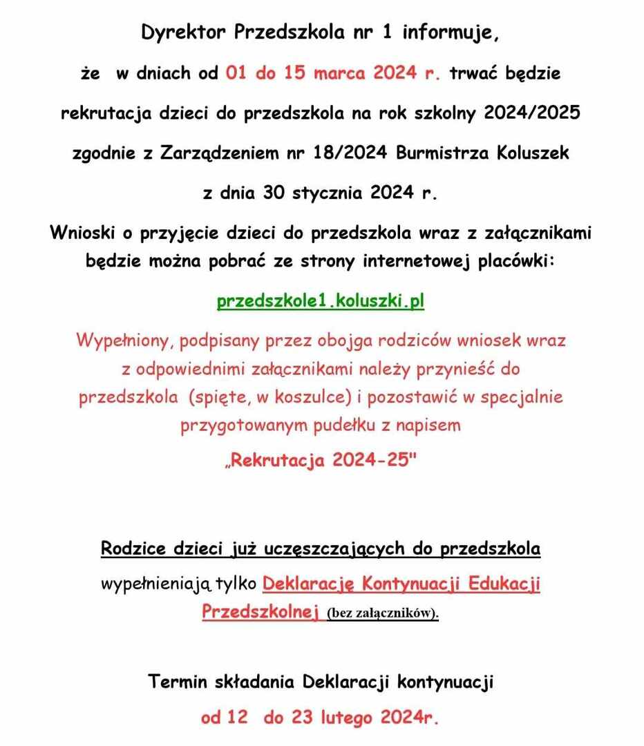 Informujemy, że w związku ze zbliżającą się rekrutacją na rok szkolny 2024/2025, rodzice dzieci uczęszczających w bieżącym roku szkolnym 2023/2024 do naszego przedszkola, chcący aby ich pociecha została przyjęta na nowy rok szkolny, powinni złożyć do dyrektora przedszkola deklarację o kontynuowaniu wychowania przedszkolnego.
