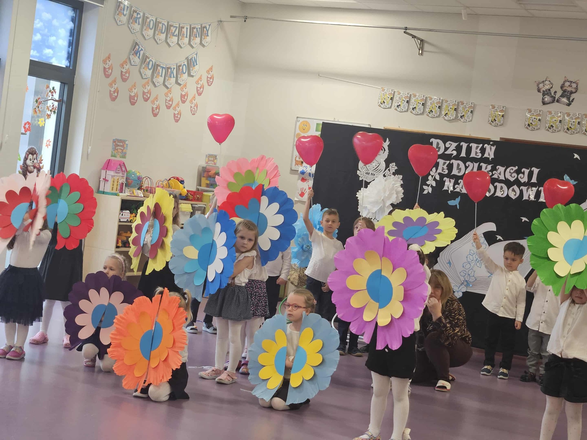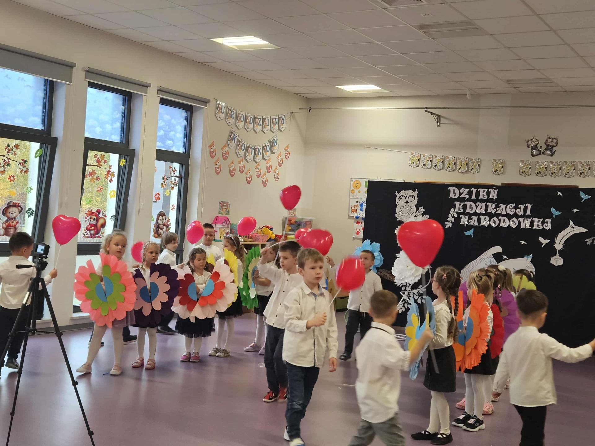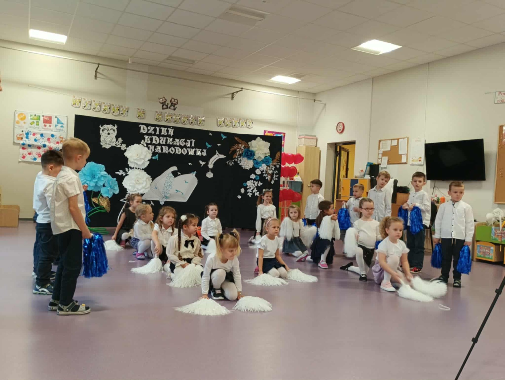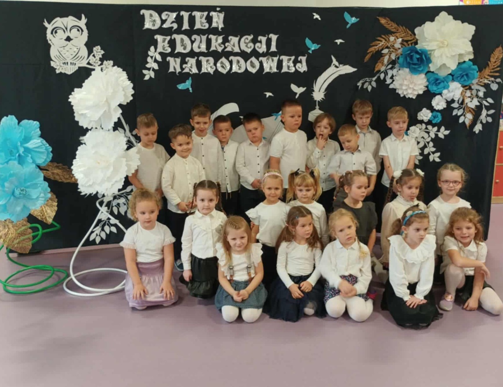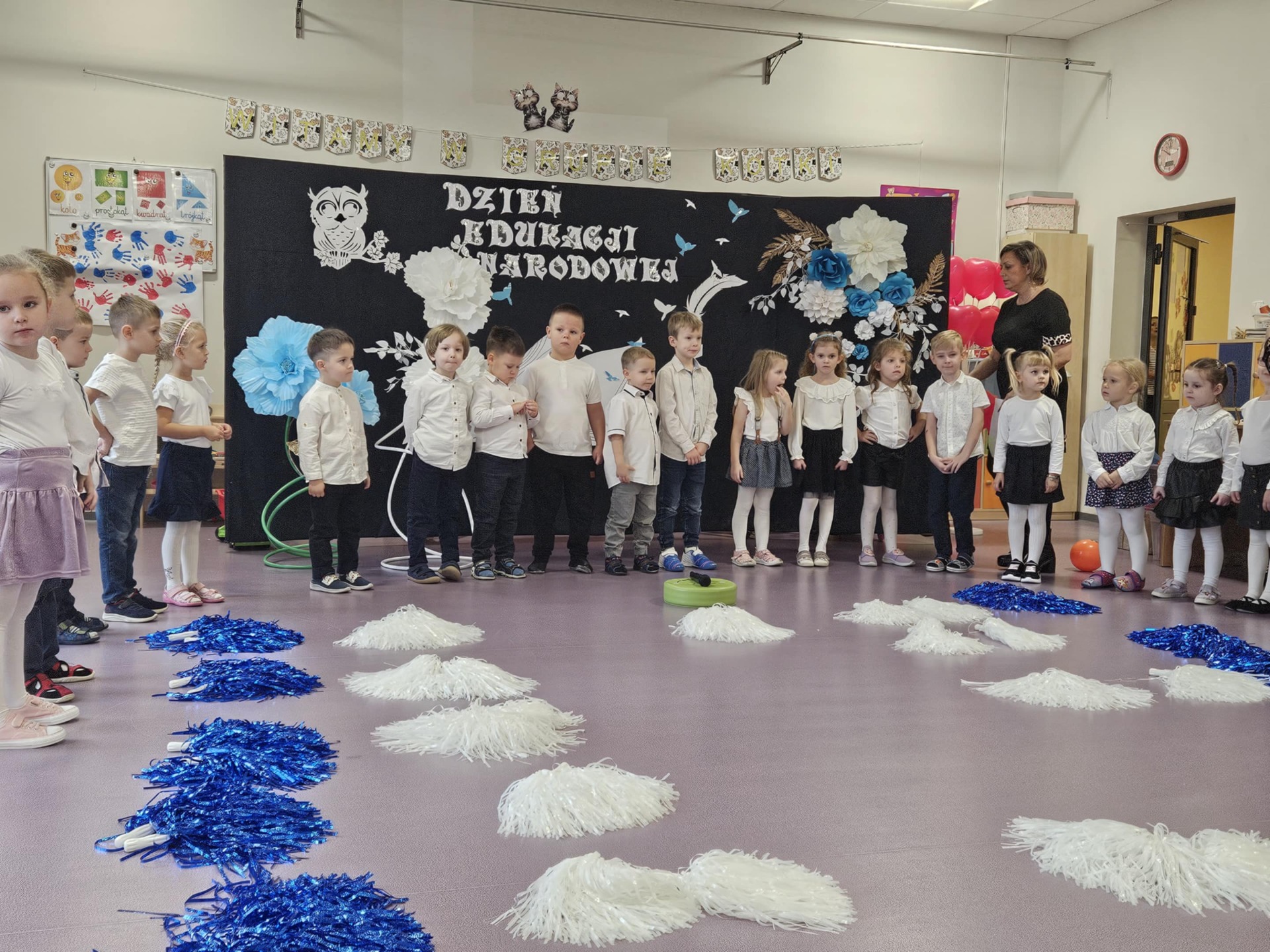 Z okazji Dnia Edukacji Narodowej dzieci z grupy „Smerfy” przygotowały dla pracowników przedszkola wyjątkowy program artystyczny, pełen radości, muzyki i humoru. Dzieci recytowały krótkie wierszyki i rymowanki o pracy nauczyciela, podkreślając, jak ważna i potrzebna jest jego rola w życiu każdego dziecka. Ich szczere słowa i odwaga na scenie zostały nagrodzone gromkimi brawami. Na zakończenie uroczystości „Smerfy” wręczyły wszystkim pracownikom przedszkola upominki. Ten gest był pięknym wyrazem wdzięczności i sympatii dla całego personelu przedszkola. Atmosfera podczas występu była wyjątkowo ciepła i radosna, a mali artyści udowodnili, że potrafią dać z siebie wszystko, aby sprawić radość swoim wychowawcom.