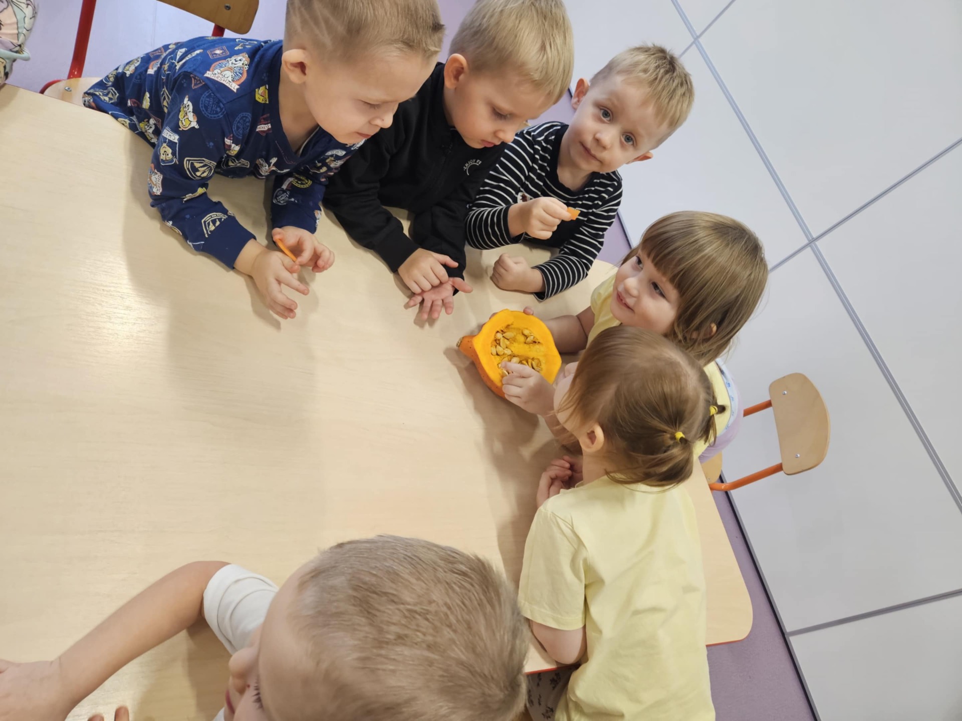 Zajęcia miały na celu zapoznanie dzieci z właściwościami i zastosowaniem dyni oraz rozwijanie umiejętności kulinarnych i plastycznych. Na początku dzieci obejrzały prawdziwą dynię – poznały jej wygląd, kolor, kształt i zapach. Rozmawialiśmy o tym, do czego można wykorzystać dynię w kuchni oraz jakie potrawy można z niej przygotować. Następnie wspólnie przygotowaliśmy ciasto na babeczki dyniowe – dzieci pomagały w odmierzaniu składników, mieszaniu i nakładaniu masy do foremek. W czasie, gdy babeczki się piekły, dzieci wykonywały prace plastyczne o tematyce dyniowej, wykorzystując m.in. masę solną i farby. Na zakończenie odbyła się degustacja upieczonych babeczek, a dzieci chętnie dzieliły się swoimi wrażeniami smakowymi. Zajęcia przebiegły w radosnej i jesiennej atmosferze, sprzyjającej integracji grupy oraz rozwijaniu zainteresowań kulinarnych i artystycznych.