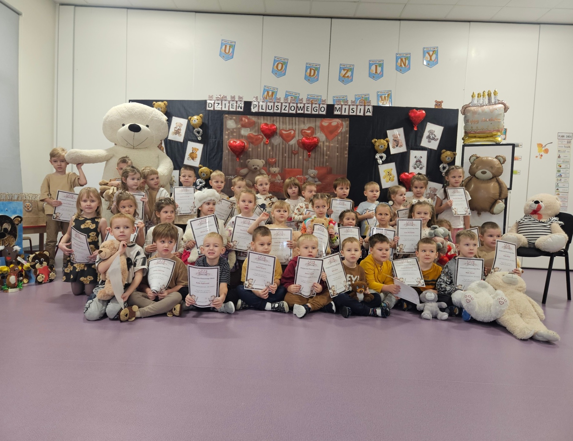 Dziś w naszym przedszkolu świętowaliśmy wyjątkowe, pełne uśmiechu i ciepła święto – Dzień Pluszowego Misia. Już od rana w sali panowała radosna atmosfera, a dzieci dumnie prezentowały swoje ukochane pluszowe przytulanki. Każdy miś był inny – mały, duży, puchaty, kolorowy – ale wszystkie równie ważne dla swoich właścicieli.
