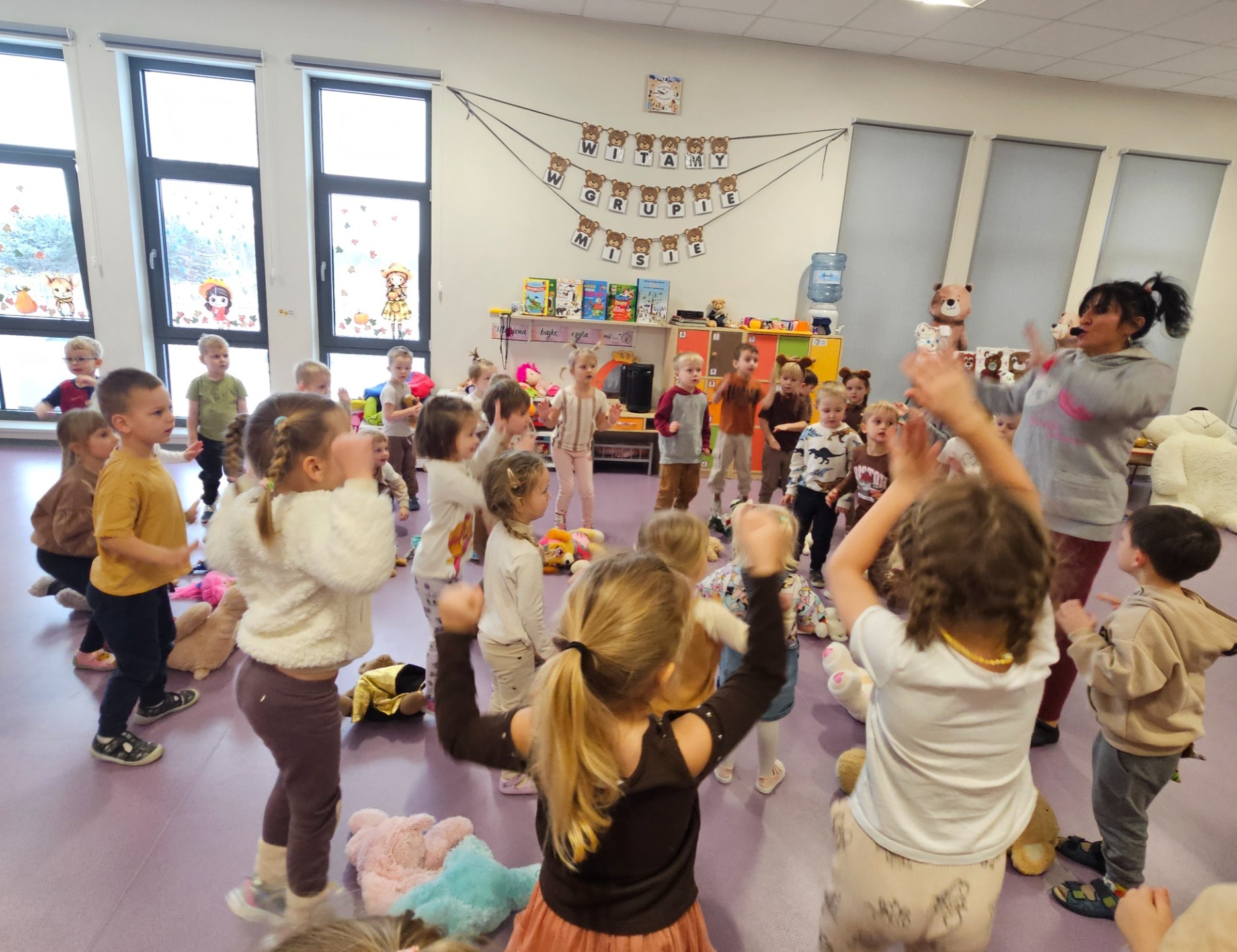 Na początku dnia wspólnie powitaliśmy pluszowych gości, a następnie rozpoczęliśmy rytmiczną rozgrzewkę „Misiowa gimnastyka”. Przy wesołej muzyce dzieci z Panią Kasią naśladowały ruchy misiów: przeciągały się jak misie po przebudzeniu, maszerowały jak niedźwiadki po lesie, tupały ciężkimi łapami oraz kołysały się jak śpiące misie na zimowym spoczynku. Zajęcia rytmiczne wprawiły wszystkich w doskonały humor.