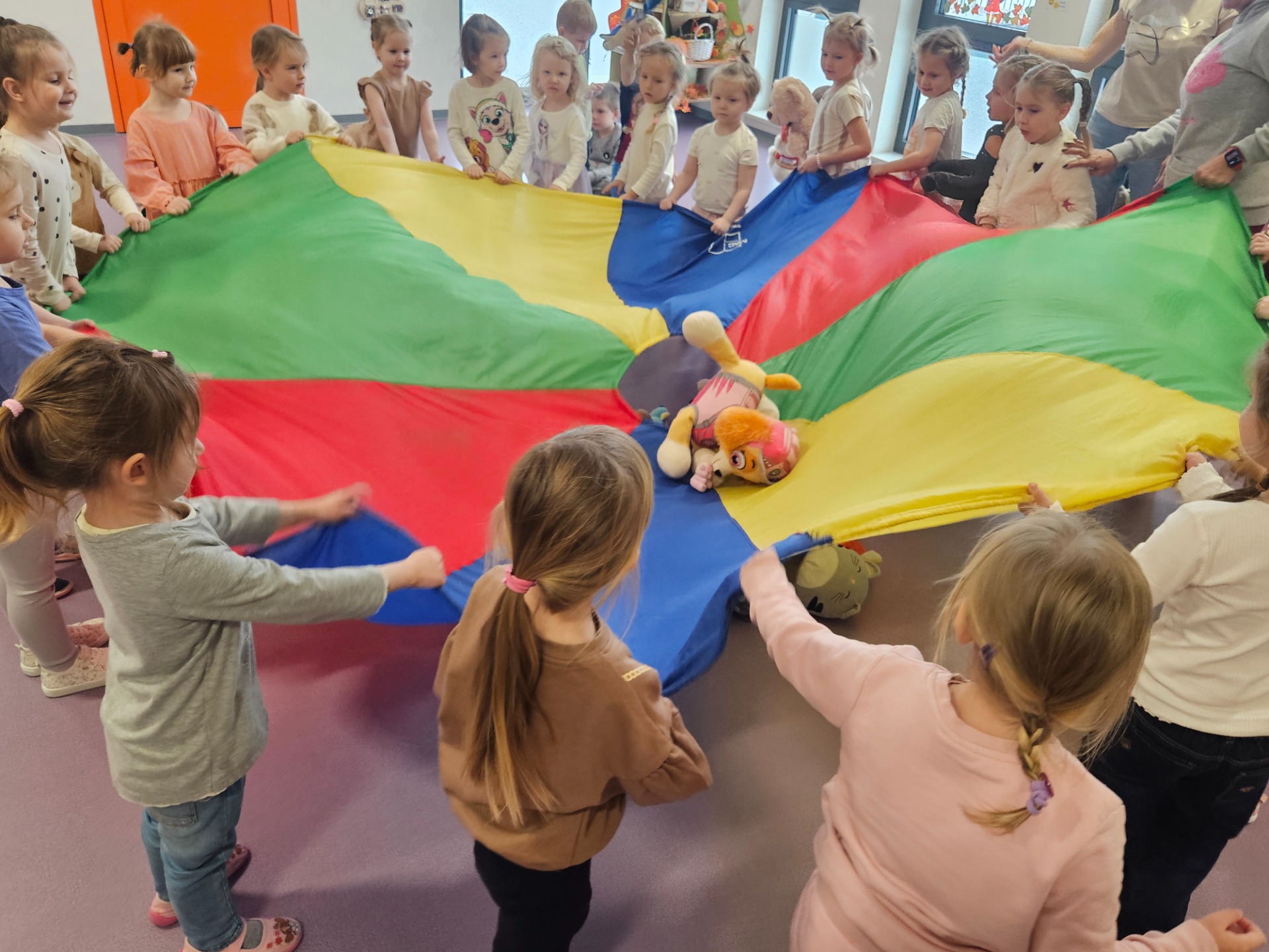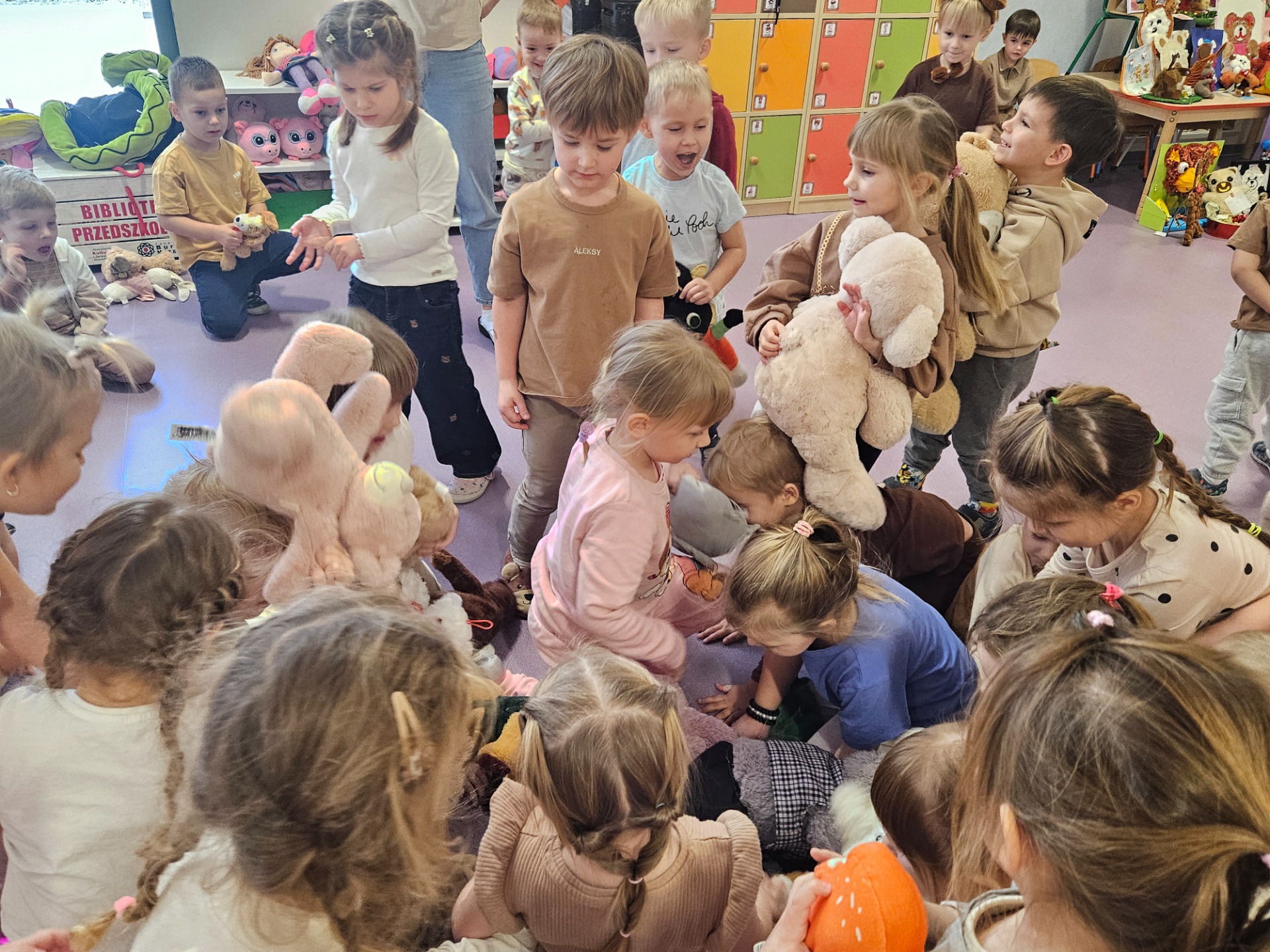Kolejnym punktem dnia była zabawa z własnymi maskotkami. Dzieci w parach tańczyły z misiem do spokojnej muzyki, tworzyły „misiową karuzelę”, a także bawiły się w „Podaj misia”, ćwicząc współpracę oraz zręczność. Nie zabrakło również krótkiej opowieści o historii pluszowego misia oraz rozmowy o tym, dlaczego przytulanki są dla nas ważne.